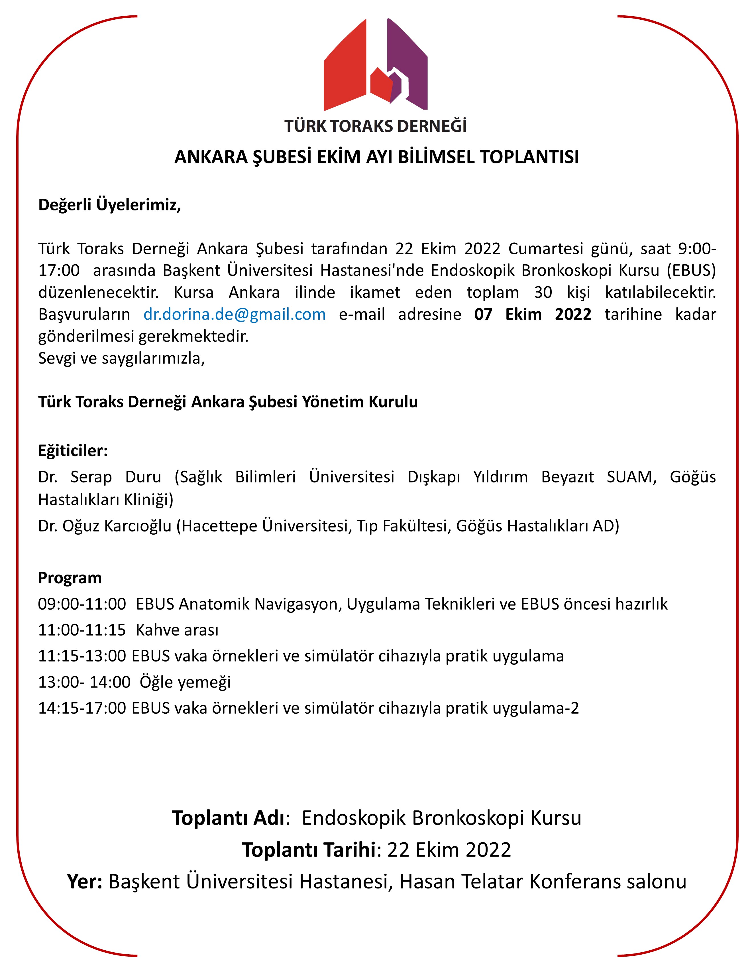 Türk Toraks Derneği Ankara Şubesi tarafından 22 Ekim 2022 Cumartesi günü, saat 9:00-17:00 arasında Başkent Üniversitesi Hastanesi'nde Endoskopik Bronkoskopi Kursu (EBUS) düzenlenecektir.