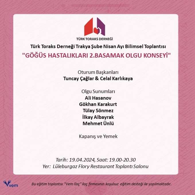 Türk Toraks Derneği Trakya Şubesi Nisan Ayı Bilimsel Toplantı Duyurumuz: "Göğüs Hastalıkları 2.Basamak Olgu Konseyi"