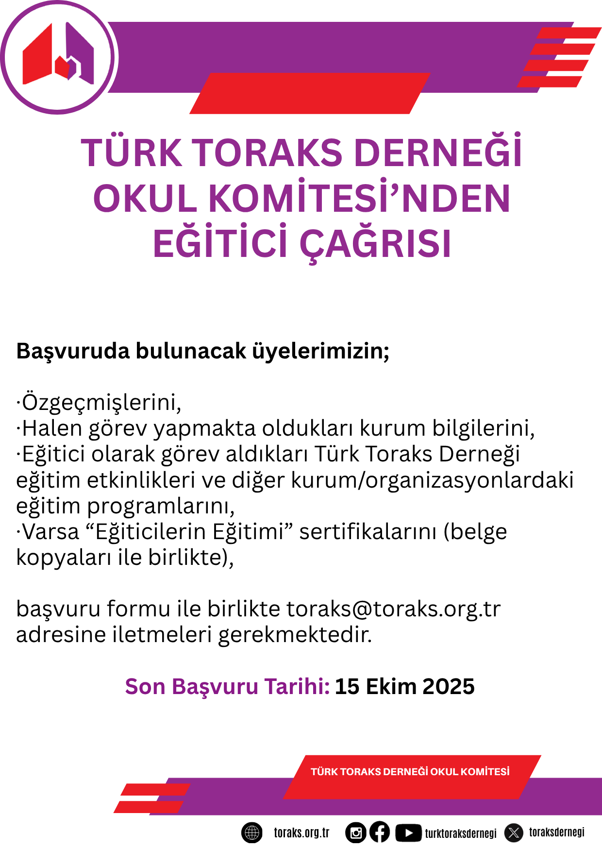 Ekteki başvuru formu ile birlikte en geç 15 Ekim 2025 tarihine kadar [email protected] adresine ileterek, bizimle paylaşmaları rica olunur.