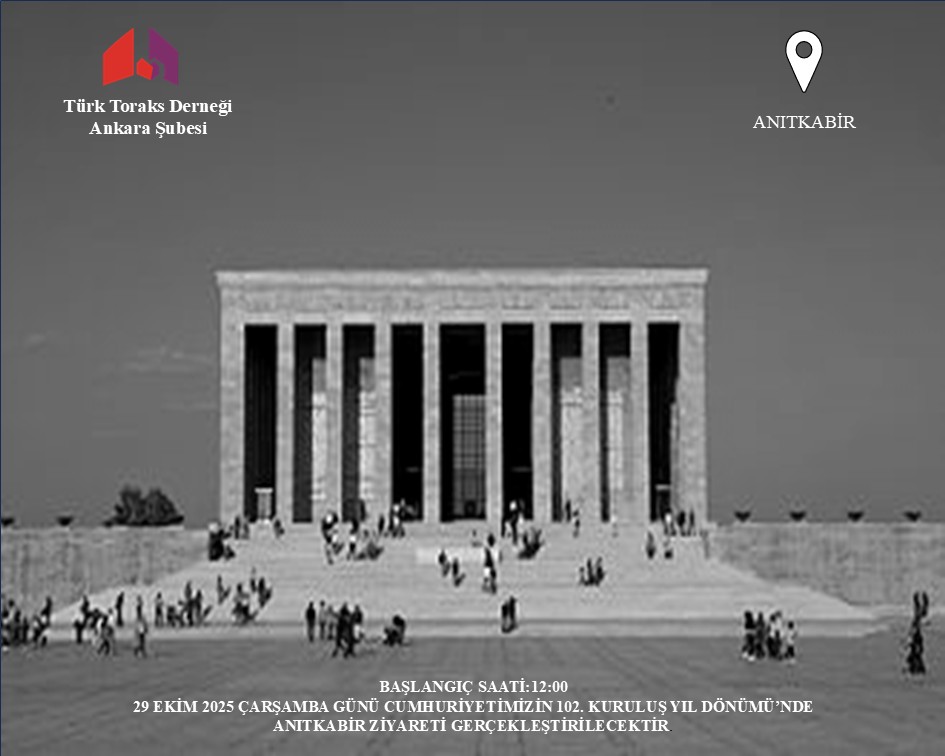 Türk Toraks Derneği Ankara Şubesi Yönetim Kurulu olarak “CUMHURİYETİMİZİN 102. KURULUŞ YIL DÖNÜMÜ’NDE” Cumhuriyet'in kurucusu Ulu Önder Mustafa Kemal Atatürk'ün ebedi istirahatgahı olan Anıtkabir’i 29 Ekim 2025 Çarşamba günü saat 12:00’da ziyaret edeceğiz.