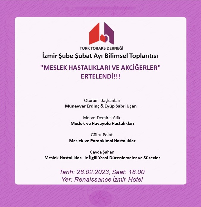28 Şubat 2023 Salı günü,18.00-19.30 saatleri arasında İzmir'de gerçekleştirilecek olan "Meslek Hastalıkları ve Akciğerler" başlıklı Türk Toraks Derneği İzmir Şubesi şubat ayı bilimsel toplantısı yaşanan deprem nedeni ile ileri bir tarihe ertelenmiştir.