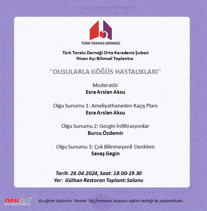 Türk Toraks Derneği Orta Karadeniz Şubesi Nisan Ayı Bilimsel Toplantısı Duyurumuz: "Olgularla Göğüs Hastalıkları"