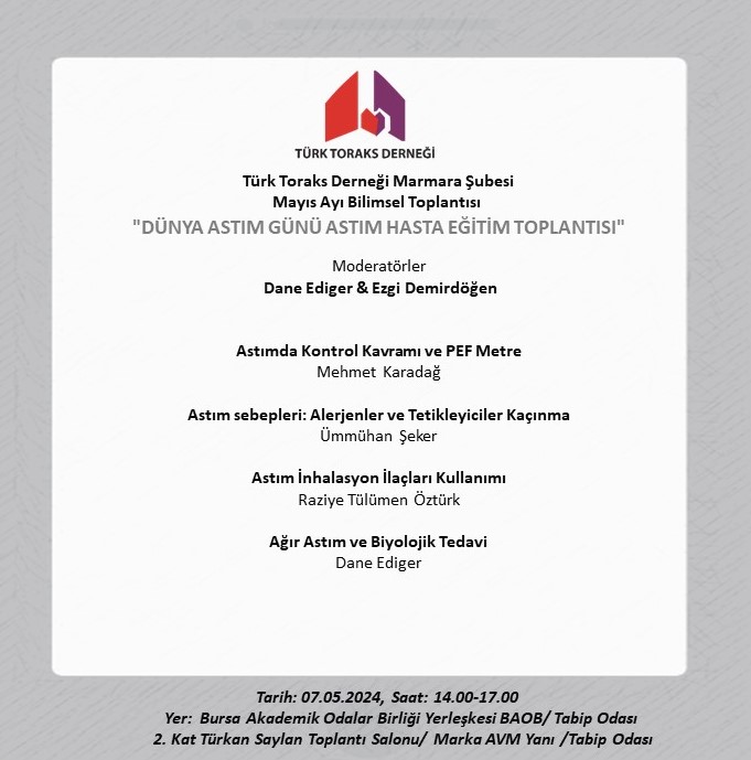 Türk Toraks Derneği Marmara Şubesi Mayıs Ayı Bilimsel Toplantı Duyurumuz: "Dünya Astım Günü Astım Hasta Eğitim Toplantısı"