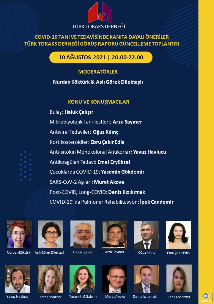 Toplantının başlığı "COVID-19 Tanı ve Tedavisinde Kanıta Dayalı Öneriler Türk Toraks Derneği Görüş Raporu Güncelleme" olarak belirlenmiş olup ayrıntısını duyurumuzda bulabilirsiniz.