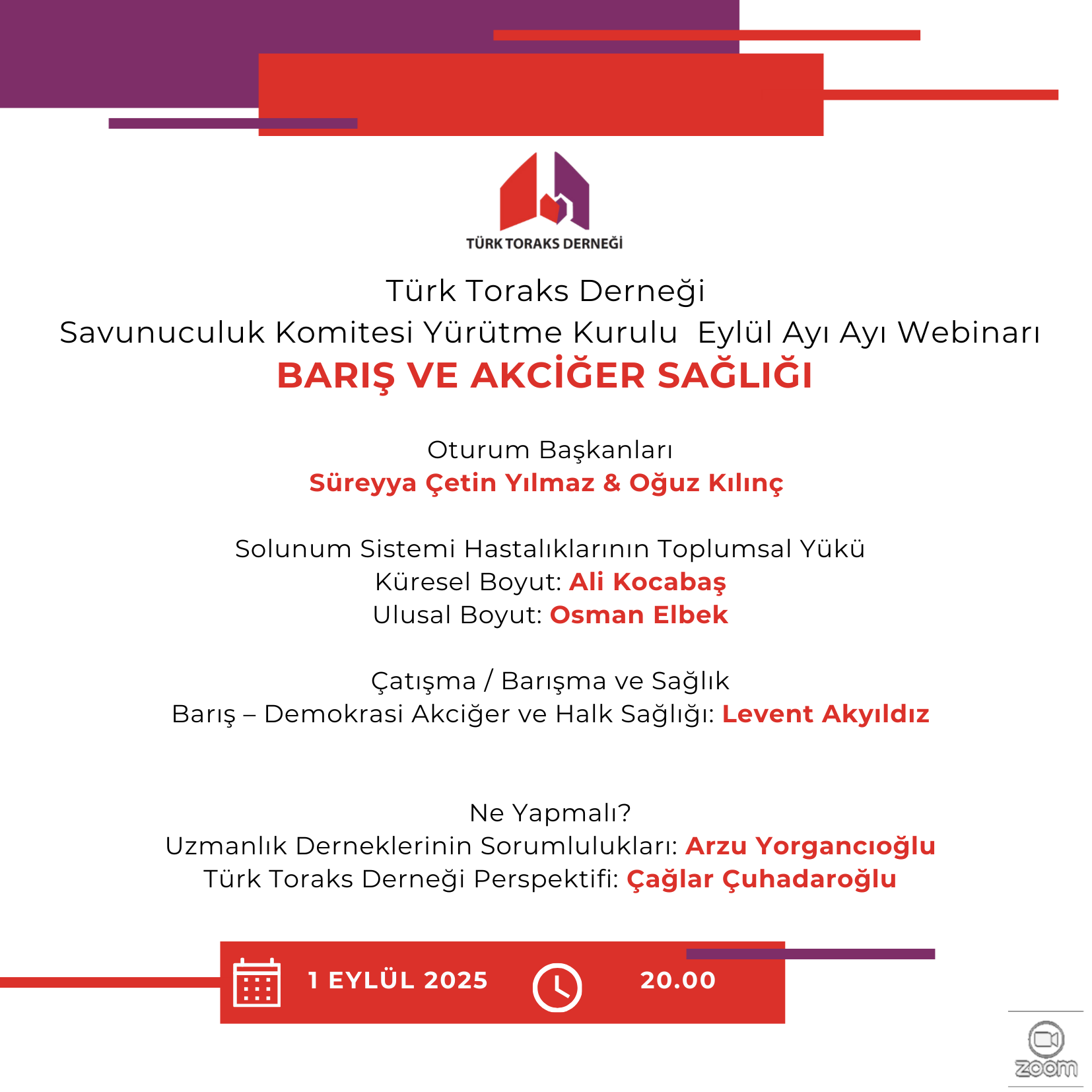 1 Eylül Dünya Barış Günü nedeni ile Türk Toraks Derneği Savunuculuk Komitesi Yürütme Kurulu Eylül ayı webinarı "Barış ve Akciğer Sağlığı" başlığı ile 1 Eylül 2025 Pazartesi günü, saat 20.00' da online olarak gerçekleştirilecektir.