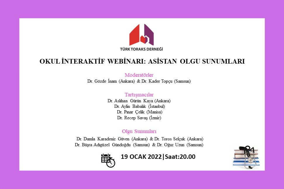 Türk Toraks Derneği okulu interaktif webinarının ilki 19 Ocak 2022 Çarşamba günü, saat 20.00 da “Asistan Olgu Sunumları” başlığı ile gerçekleştirilecek olup; katılımlarınız onur verecektir.