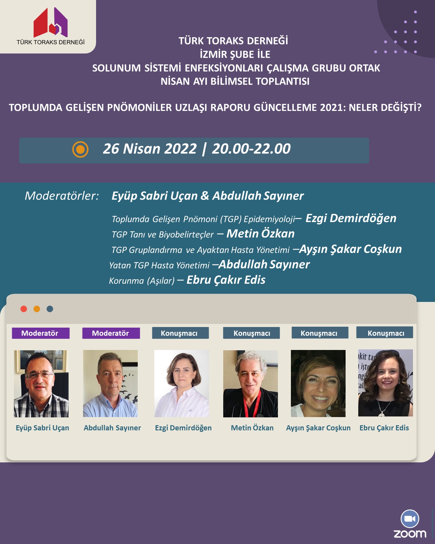 Türk Toraks Derneği İzmir Şubesi ile Solunum Sistemi Enfeksiyonları Çalışma Grubu ortak Nisan ayı webinarı 26.04.2022 Salı günü, 20.00-22.00 saatleri arasında "Toplumda Gelişen Pnömoniler Uzlaşı Raporu Güncelleme 2021: Neler Değişti?" başlığı ile gerçekleşecektir.
