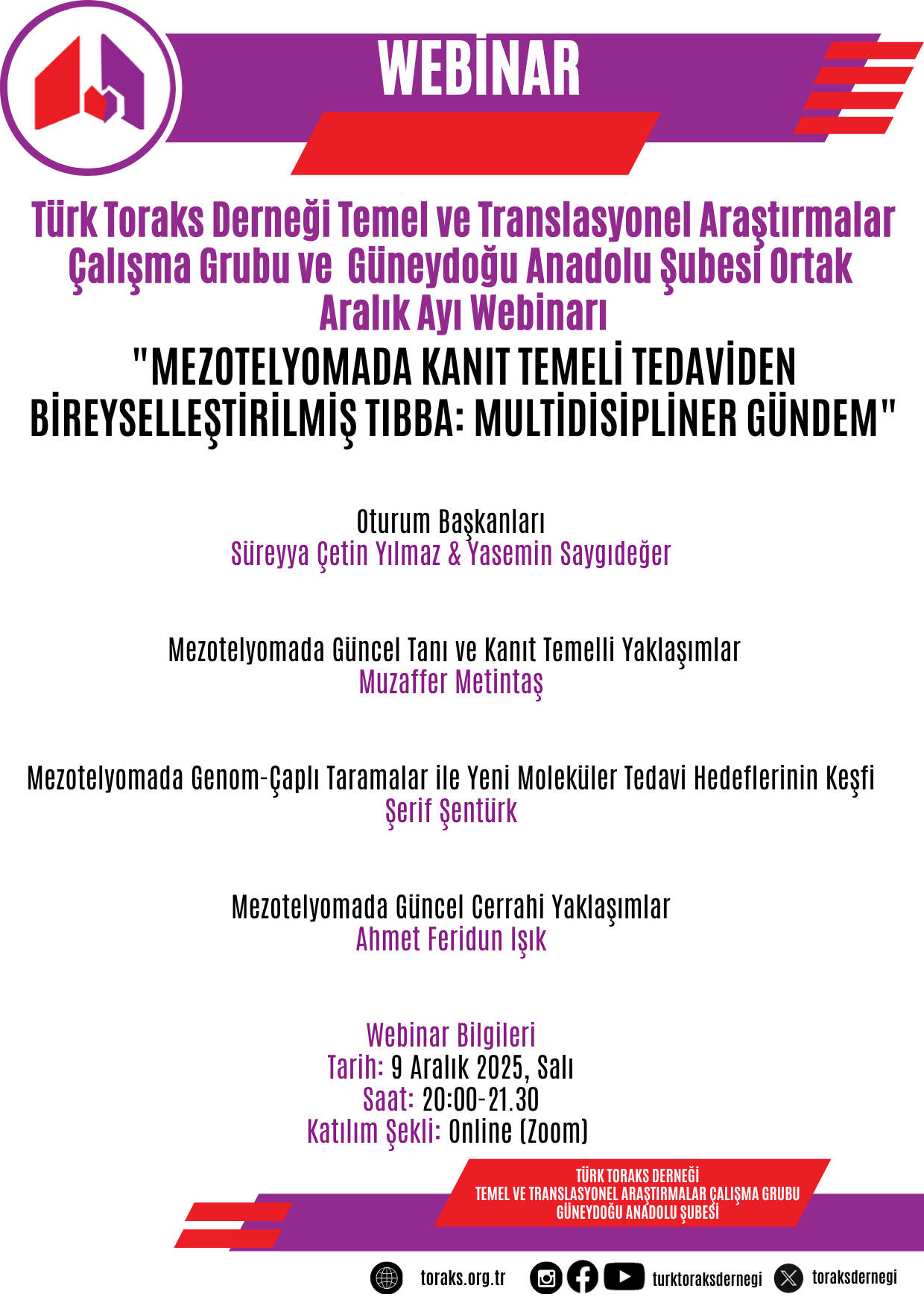 Türk Toraks Derneği Temel ve Translasyonel Araştırmalar Çalışma Grubu'nun Güneydoğu Anadolu Şubesi ile ortak düzenlediği Aralık ayı webinarı "Mezotelyomada Kanıt Temeli Tedaviden Bireyselleştirilmiş Tıbba: Multidisipliner Gündem" başlığı ile 9 Aralık 2025 Salı günü, 20.00-21.30 saatleri arasında online olarak gerçekleştirilecektir.
