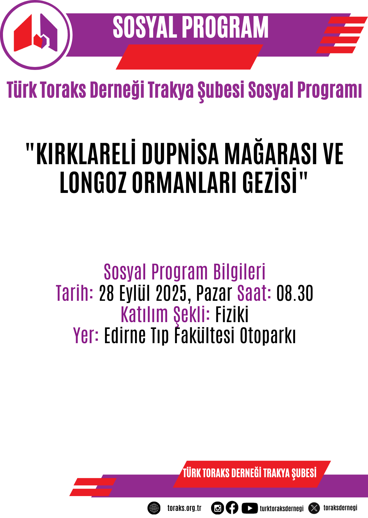 Türk Toraks Derneği Trakya Şubesi olarak düzenleyeceğimiz, "Kırklareli Dupnisa Mağarası ve Longoz Ormanları Gezisi" isimli sosyal aktivitemize sizleri davet ediyoruz.