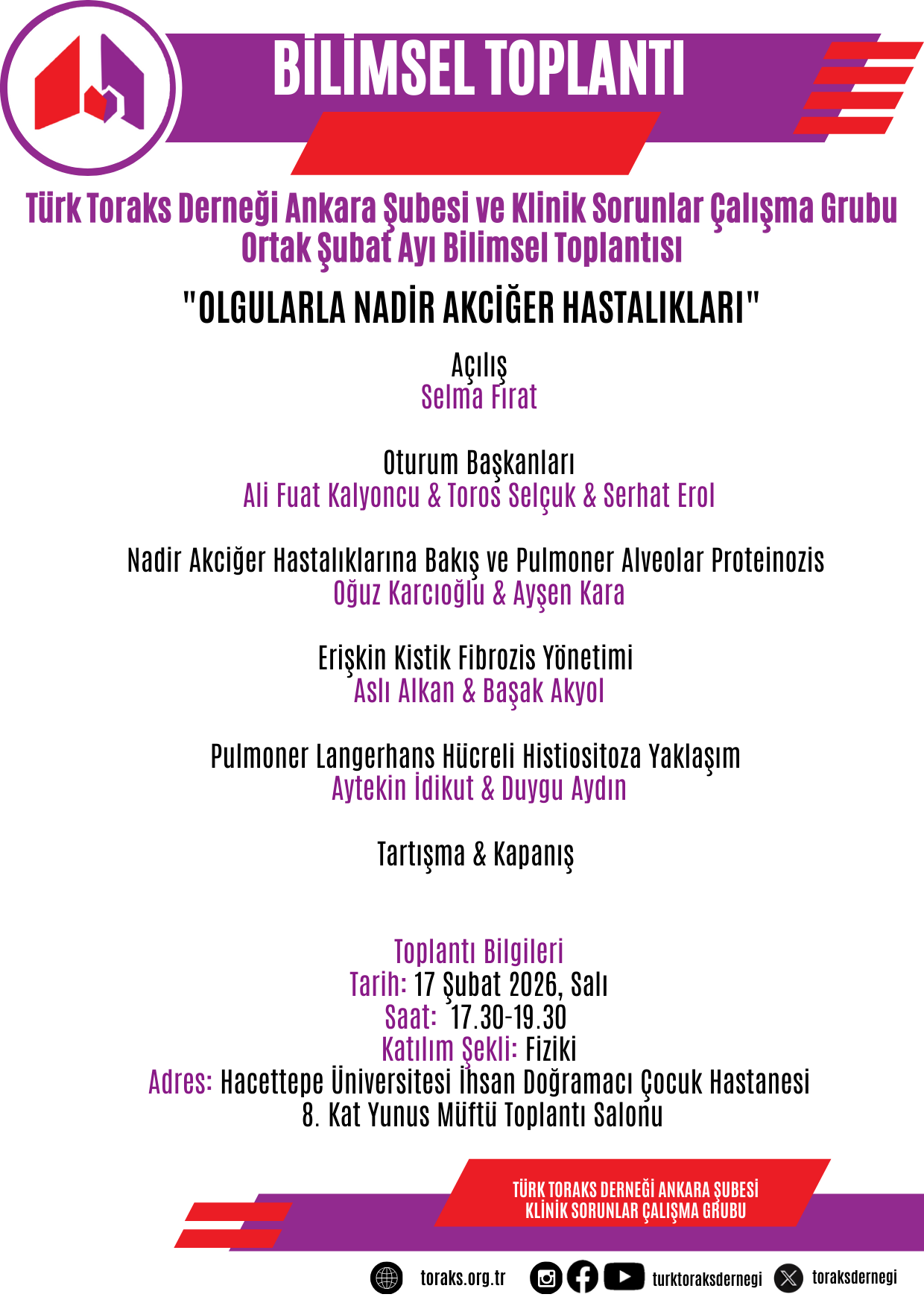 Türk Toraks Derneği Ankara Şubesi'nin Klinik Sorunlar Çalışma Grubu ile ortak düzenlediği Şubat ayı bilimsel toplantısı "Olgularla Nadir Akciğer Hastalıkları" başlığı ile 17 Şubat 2026 Salı günü, 17.30-19.30 saatleri Ankara' da gerçekleşecektir.