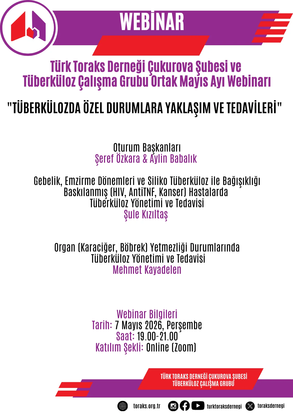 Türk Toraks Derneği Çukurova Şubesi’nin Tüberküloz Çalışma Grubu ile ortak düzenlediği Mayıs ayı webinarı 7 Mayıs Perşembe günü, 19.00-21.000 saatleri arasında online olarak gerçekleştirilecektir.